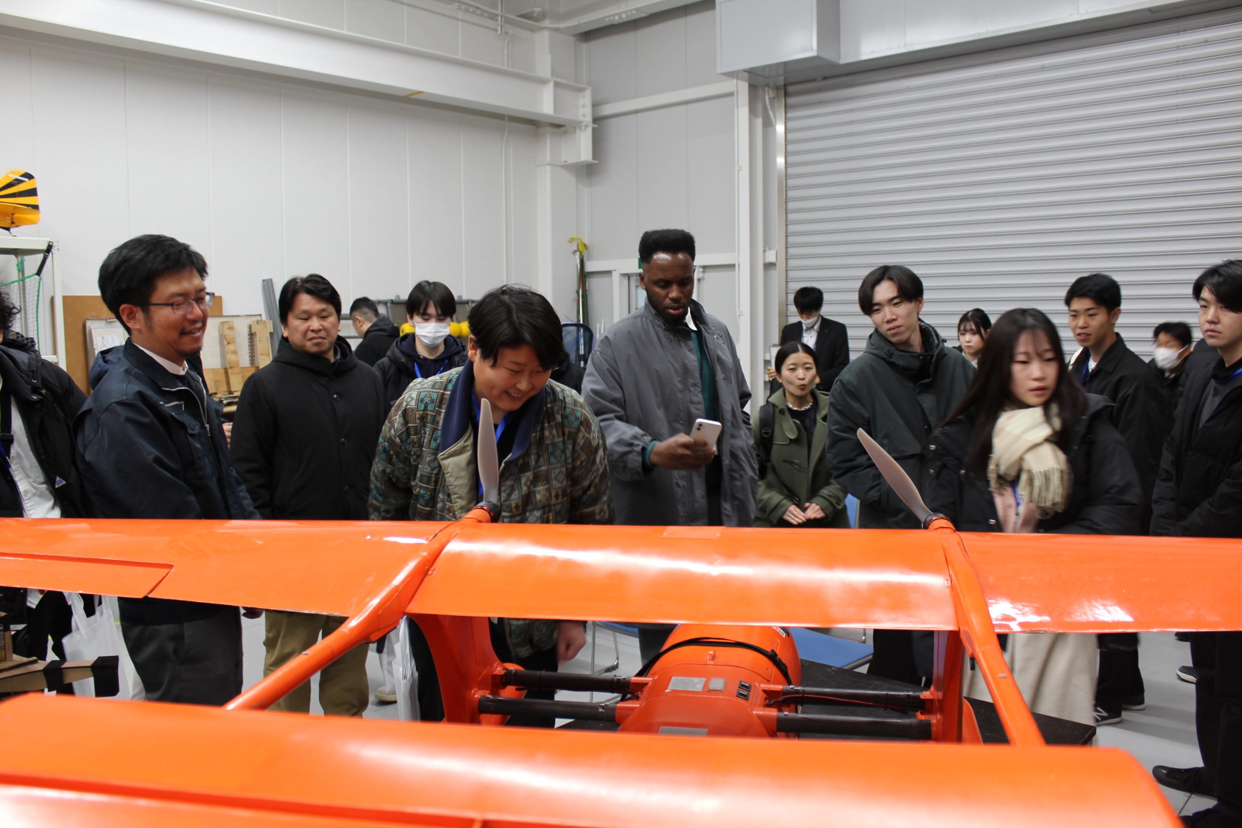 金田社長より起業の経緯や固定翼ドローンについて伺いました。陸上での離着陸だと滑走路が100mは必要だが、水上だと6mで済み、河川や湖、海洋など日本に多く広がる水域からの離着水を行え、航空時間も長いので、能登の被災地でも活躍したお話しをご説明いただきました。また、防災等の観点から自治体からの受注もあるとのこと。