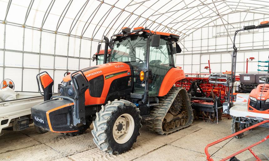 クボタ製のロボットトラクター。屋根にGPSのアンテナがあり、内部にはタブレット端末を装備し、自動運転走行が可能。