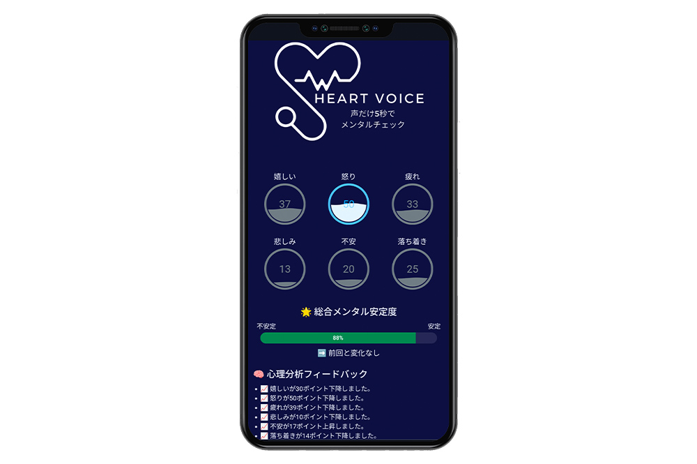 「Heart Voice」のスマートフォンでの画面イメージ。スマートフォンやタブレットに対応しており、いつでも、どこでもセルフチェックが可能だ。
