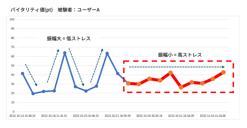 「Heart Voice」で計測した「バイタリティ値」の結果。低ストレス状態にあるときは、「バイタリティ値」の上下の変動幅が大きい。逆に、高ストレス状態にあるときは、「バイタリティ値」の変動幅が小さくなる傾向がある。