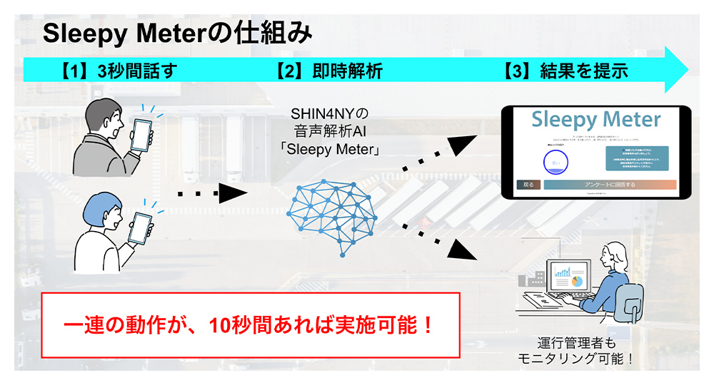 「Sleepy Meter」は、AIが声をもとに「眠気度合い」を分析し、「2時間以内」「4時間以内」の眠気リスクを推定するシステムです。長距離ドライバーの安全確保などに活用できます。
