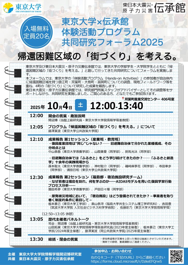 【10月4日】東京大学×伝承館 体験活動プログラム 共同研究フォーラム2025 『帰還困難区域の「街づくり」を考える。』開催
