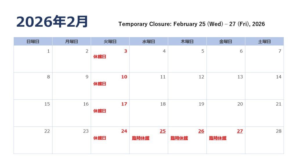 当館は2026年2月25日(水)から27日(金)まで、館内メンテナンス等のため、臨時休館いたします。皆様にはご不便をおかけいたしますが、何卒ご了承ください。