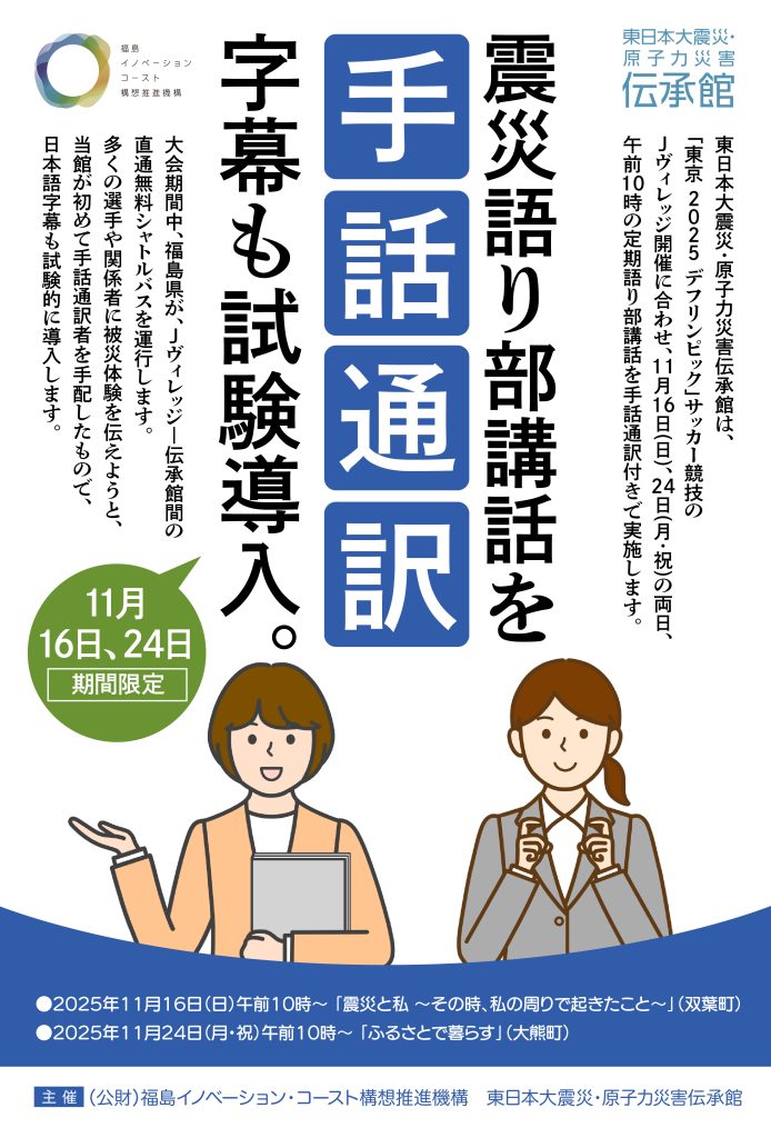 東日本大震災・原子力災害伝承館は、「東京 2025 デフリンピック」サッカー競技のJヴィレッジ開催に合わせ、11月16日(日)、24日(月・休)の両日、午前10時の定期語り部講話を手話通訳付きで実施します。