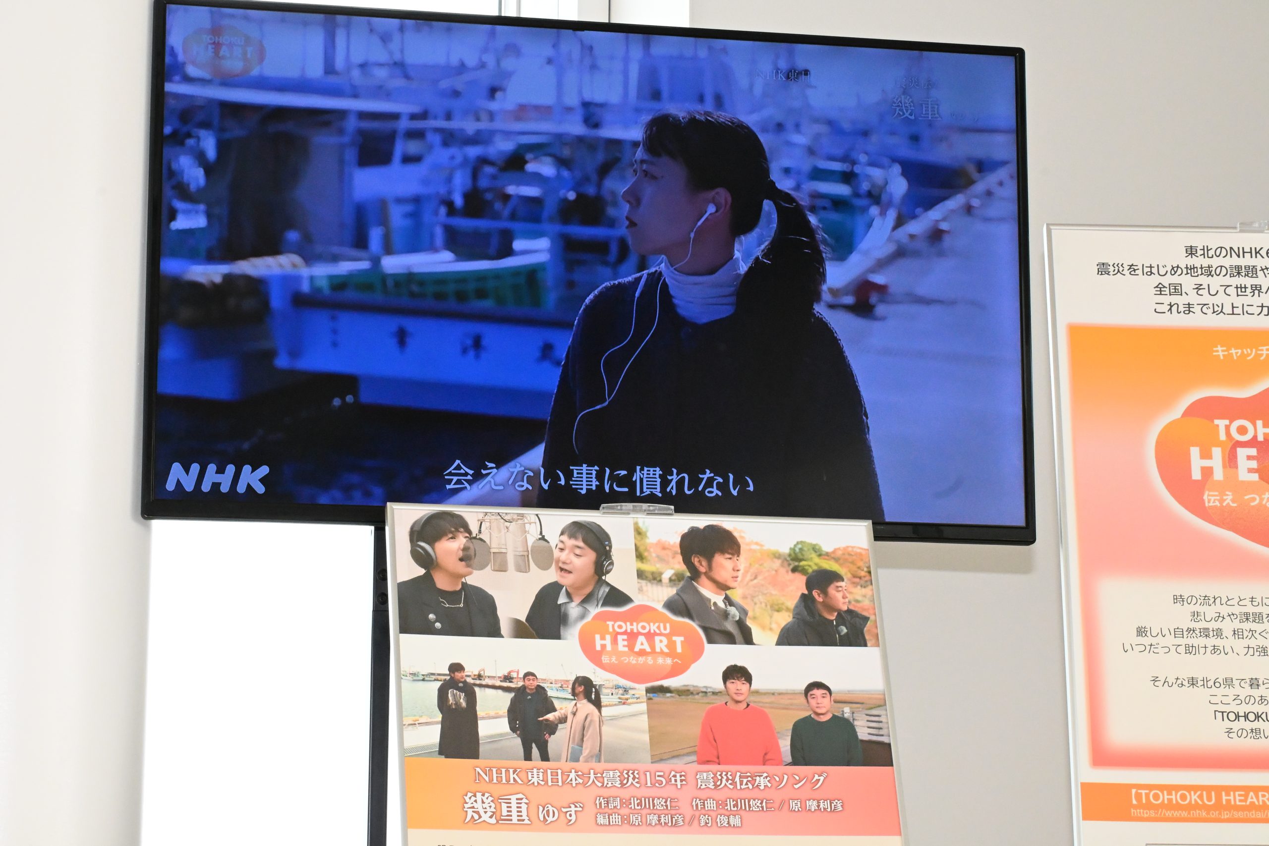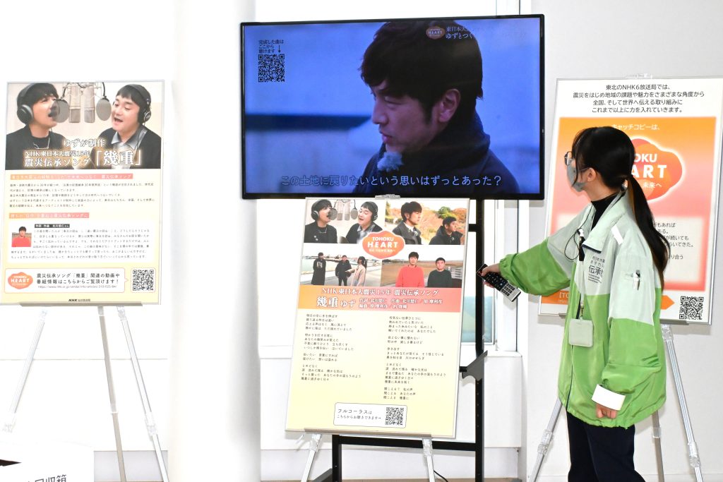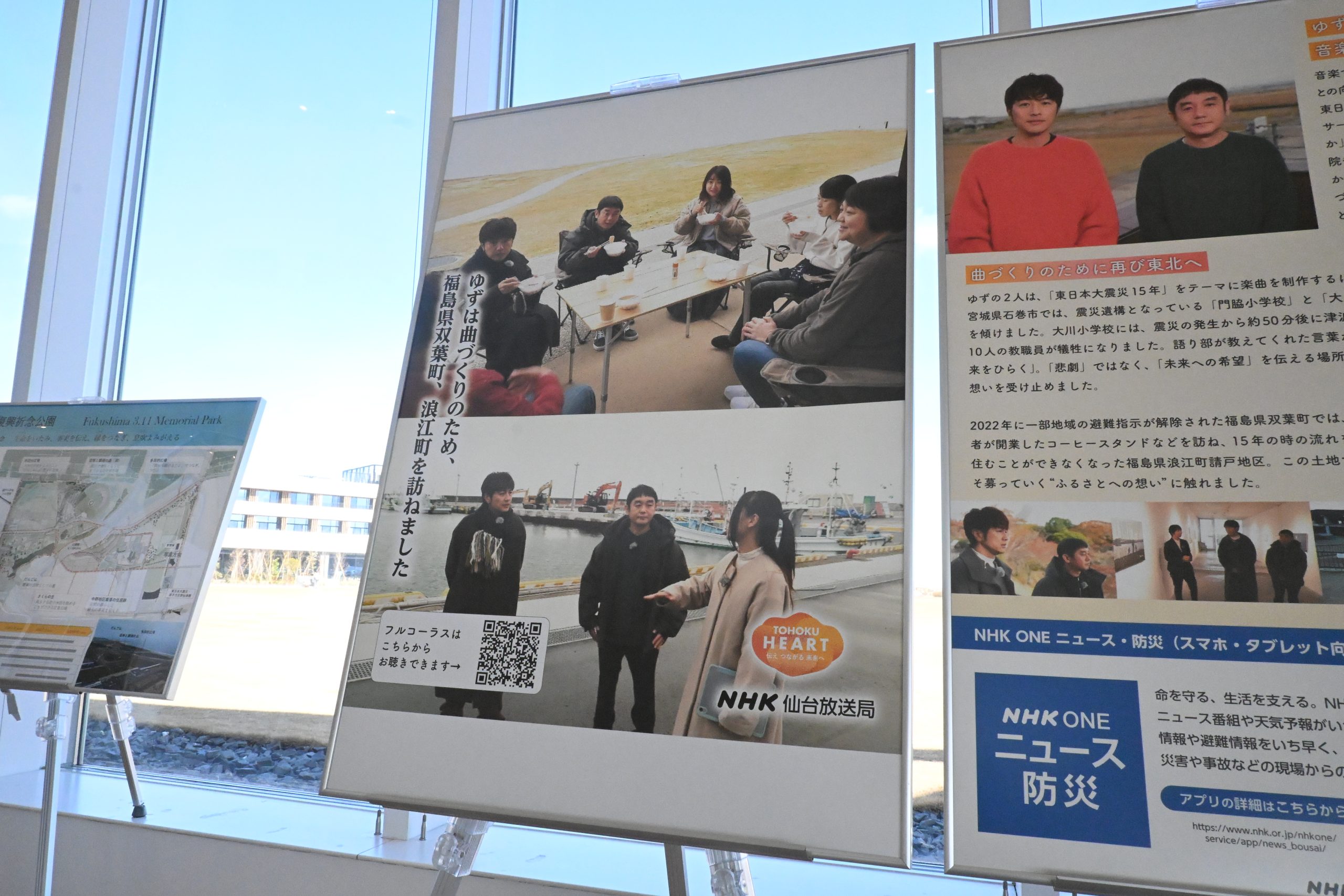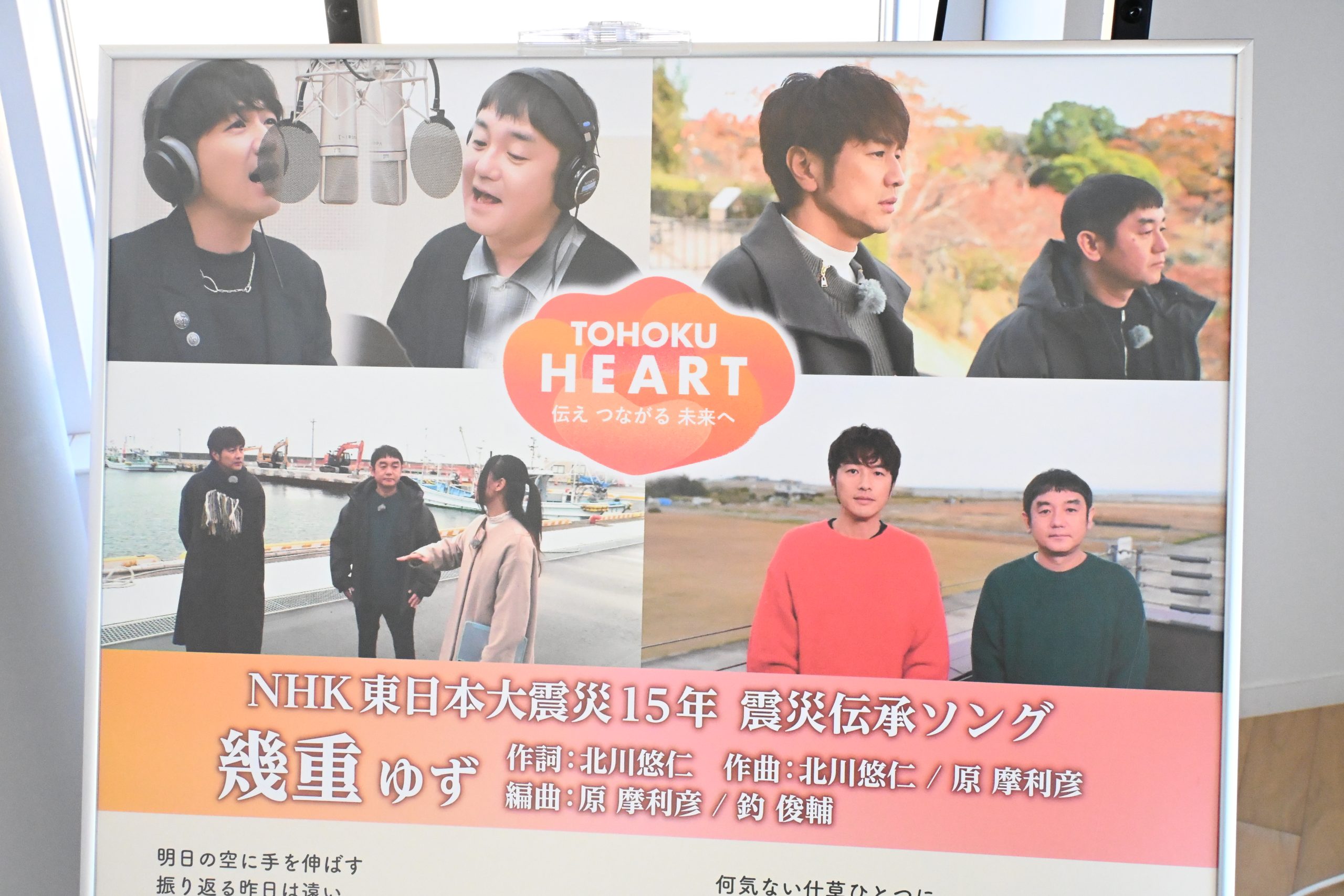 「ゆず」のお二人がNHK東日本大震災15年震災伝承ソング「幾重(いくえ)」を制作されました。当館エントランスで歌詞や制作過程の様子を映したパネルを並べ、ミュージックビデオを上映しています。