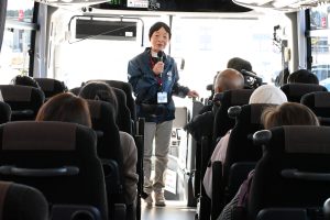 福島県の地域通訳案内士として登録されている大谷留美子さんが講師を務め、バスに同乗。「地震、津波、原発事故が起きた土地であることを想像しながら参加してください」と語りかけ、「双葉町は震災前、約7000人の町でしたが、3月12日に原発事故により県内外に避難しました。今何人が戻っていると思いますか?想像してみてください」など、参加者に質問する場面もありました。「ハンドレッド(100人)?」と答える参加者に 「とても近い。約200人が居住しています」と答えた。
