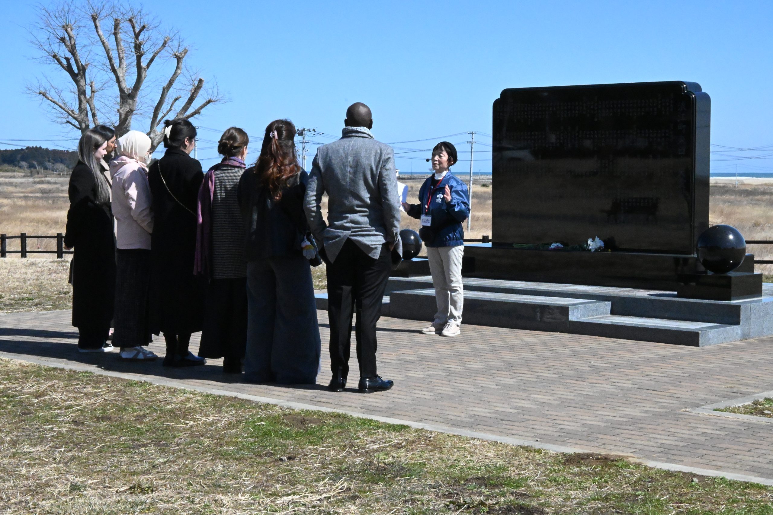沿岸部の浪江町請戸地区を見渡すことができる大平山霊園では一時的に下車し、津波犠牲者の慰霊碑の前で被害を伝えました。請戸小学校の児童が山を超えて内陸に避難し、全員が助かった経緯を紹介。一方で、原発事故により沿岸の行方不明者捜索や救助ができず、助けられるはずだった命が奪われたことも伝えました。