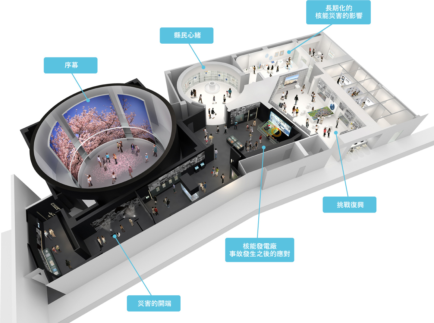 介紹福島縣克服困境,挑戰重建之路的步履.包含關於進行中的福島第一核電廠廢核工程之解說,創造理想城鎮藍圖的「造鎮模擬器」,災害應變機器人「MISORA」之展示等.