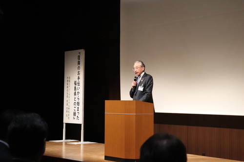 基調講演では、楢葉町で電気自動車に使用されるリチウムイオンバッテリーのニッケル酸リチウムを製造する住鉱エナジーマテリアル株式会社の安達代表取締役より「復興から始まった福島県とのご縁」というタイトルで、同社が楢葉町に進出した経緯、工場設立に際し利用した補助金等をご紹介いただきました。